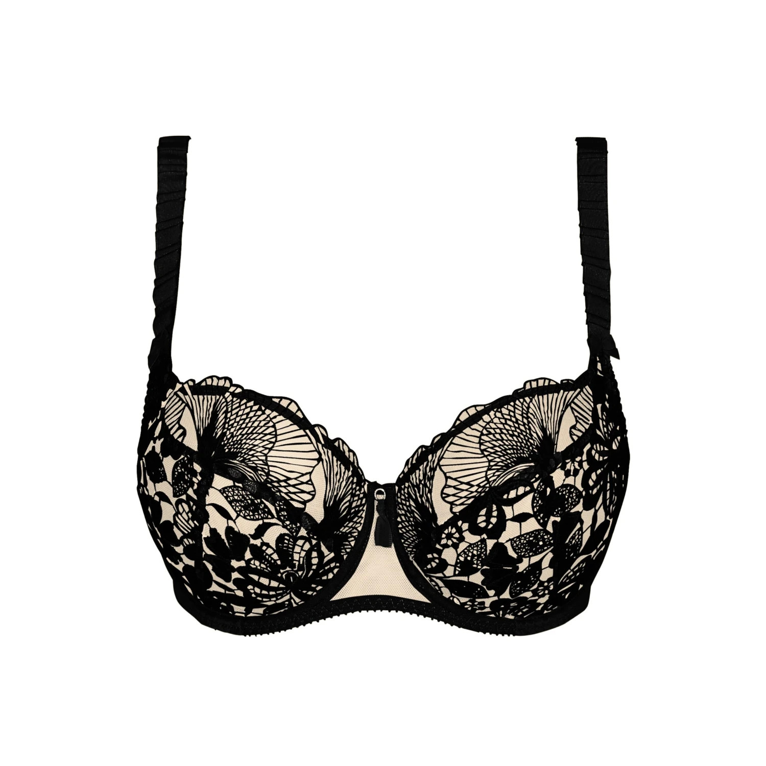 The Agathe Collection is reinvented in an intense black colour with feminine graphic contrasts. Through it’s embriodery, a tattoo effect is formed to look soft and transparent on the skin. The Low Neck Bra creates a beautiful shape with underwire for support.Â