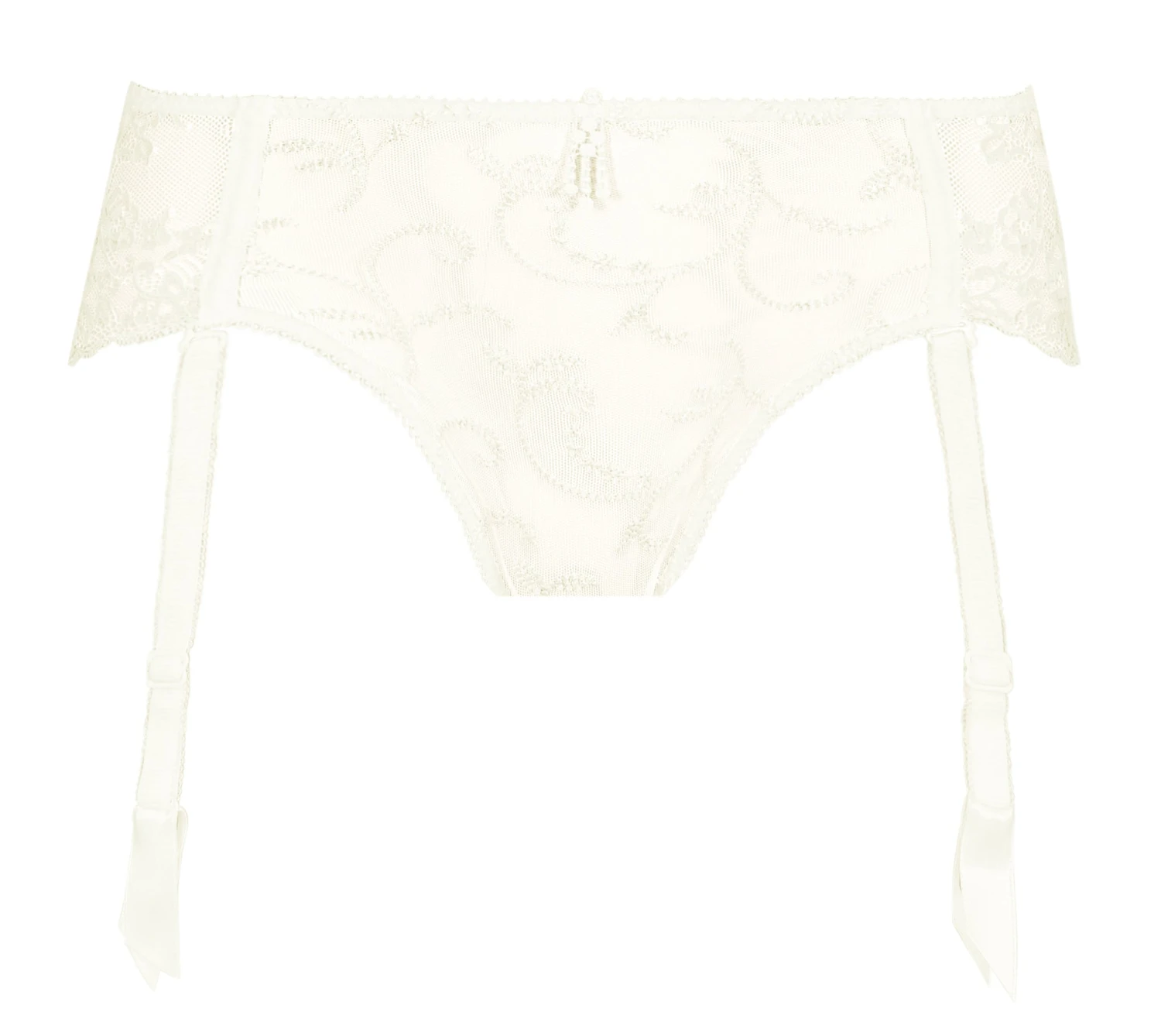 The Ginger Collection flattering high leg lace cut thong with detachable suspenders. Chic and Feminine. Great for bridal wear or any occasion.