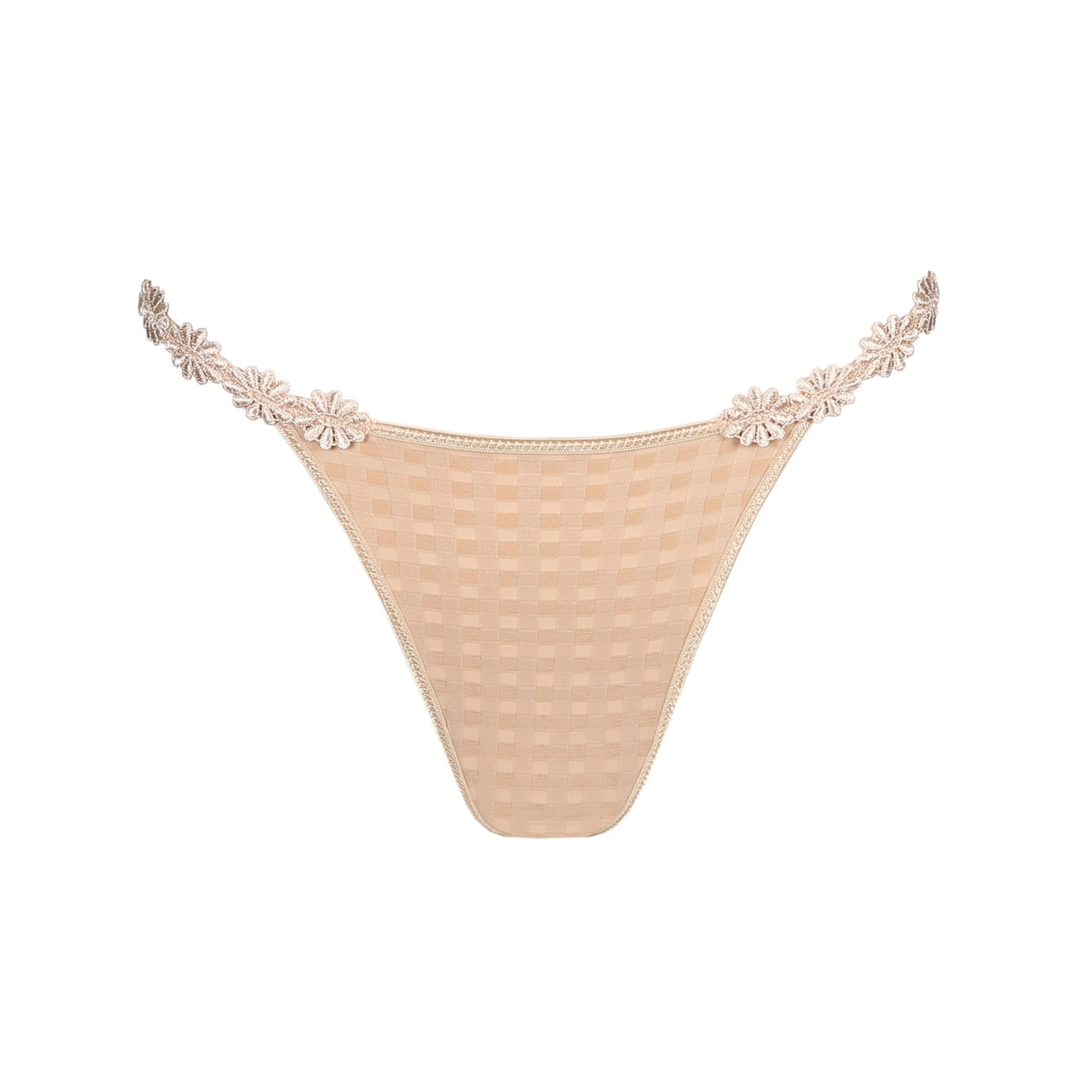 Avero string thong with pretty floral embroidery on the sides. Nude is invisible under whites.