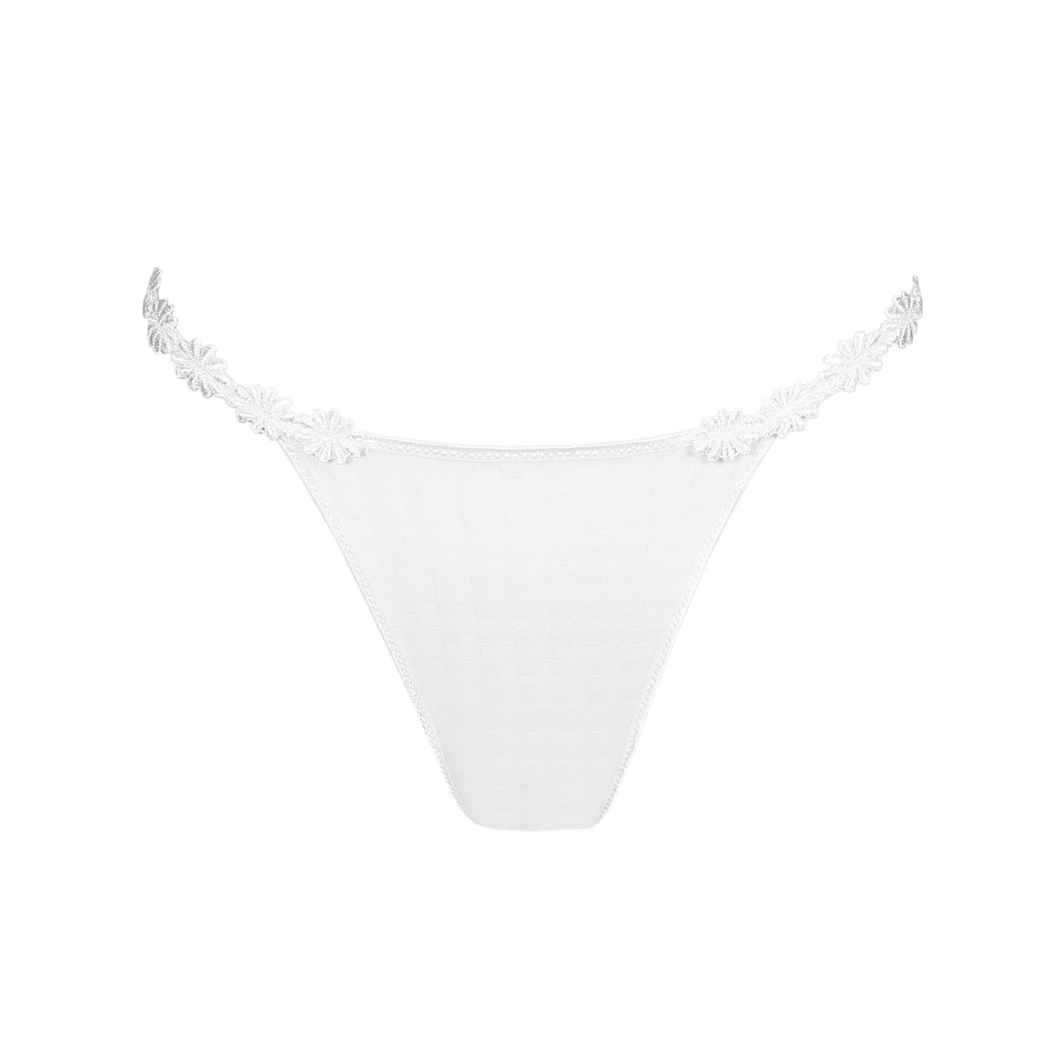 This feminine thong is opaque at the front and has elegant floral daisy embroidery on the sides of the waist. The soft band under the embroidery ensures a comfortable fit. Perfect for bridal wear.