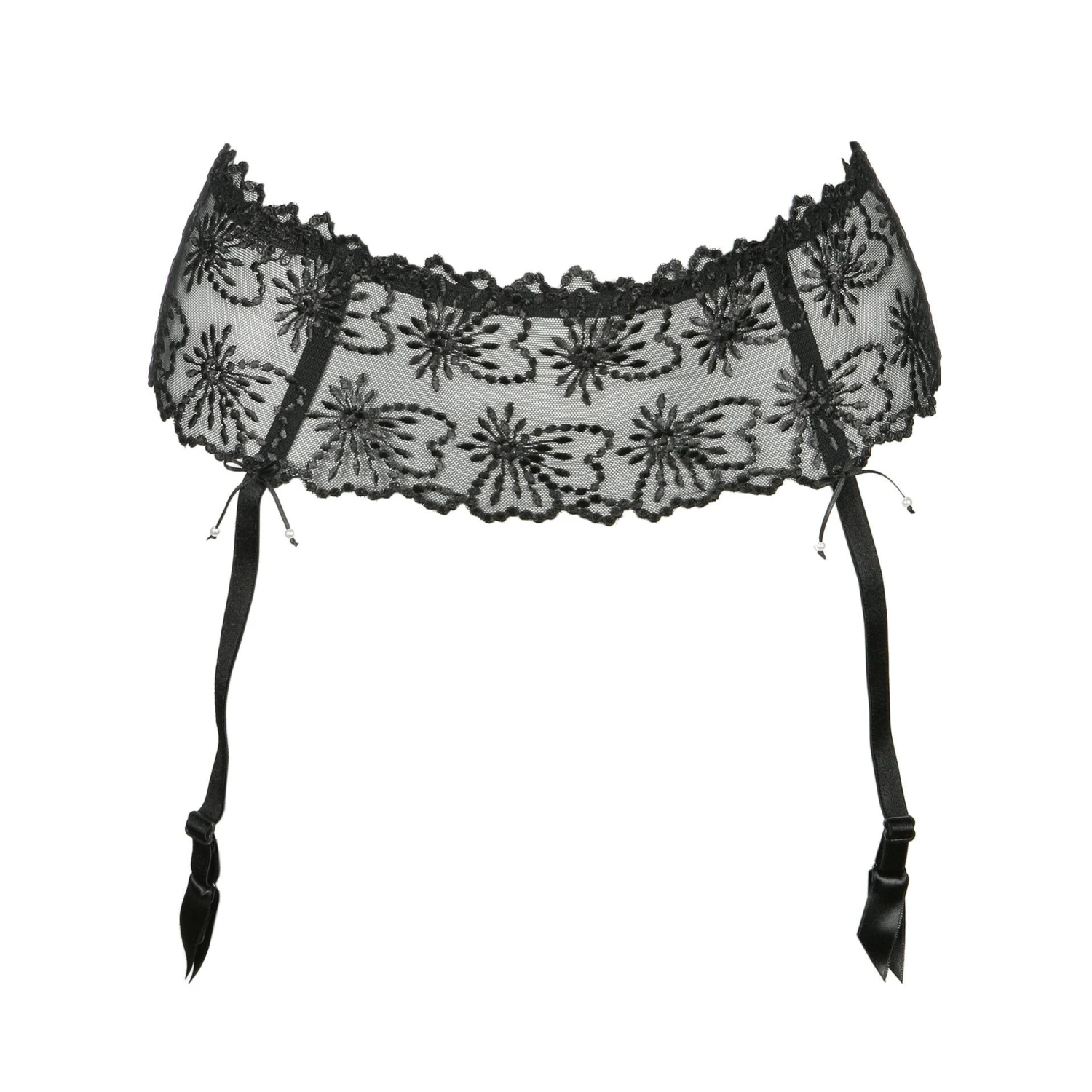 The Jane suspender belt is romantic and feminine with elegant floral lace embroidery and shimmering pearls, hook and eye fasting. Classic suspender belt.