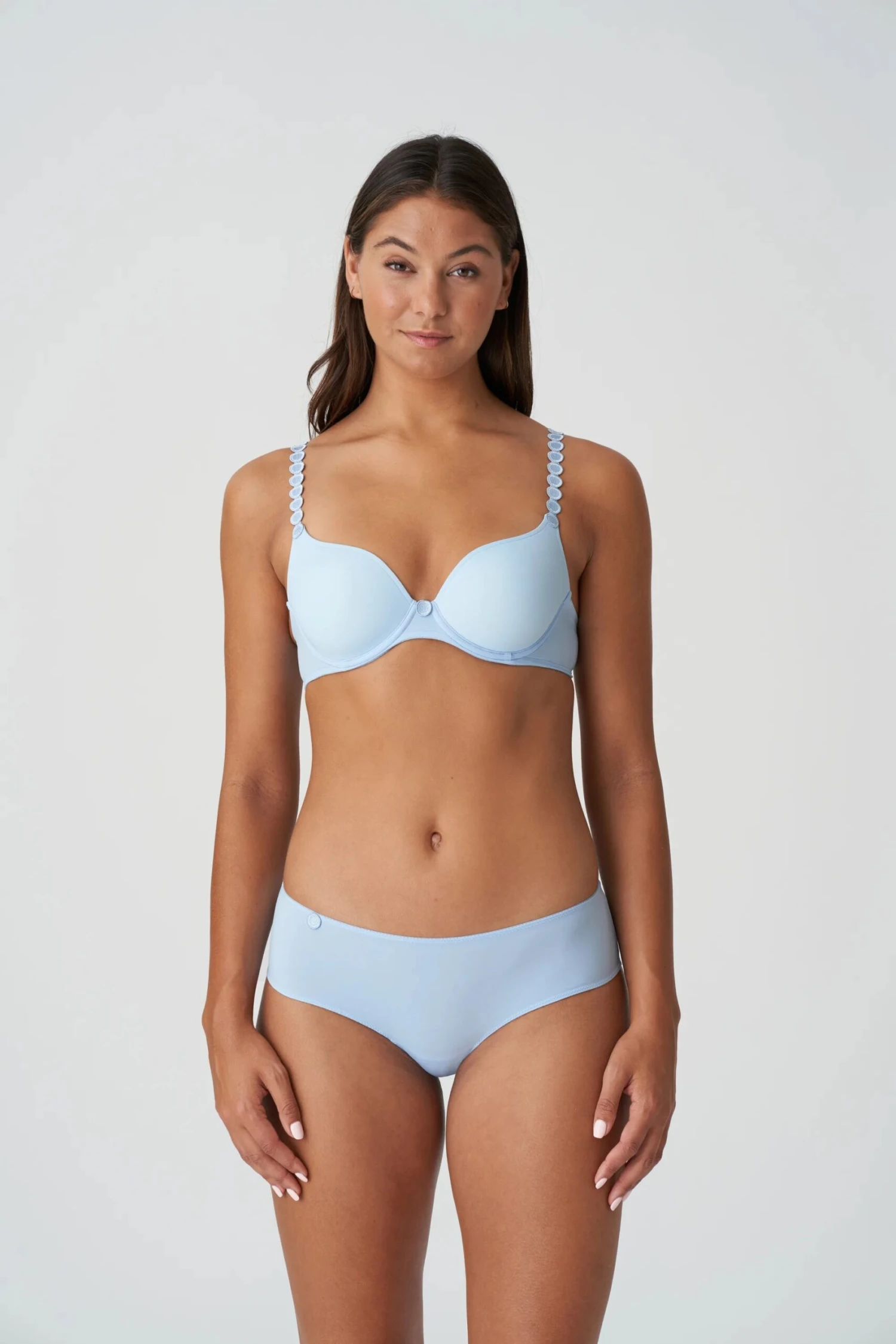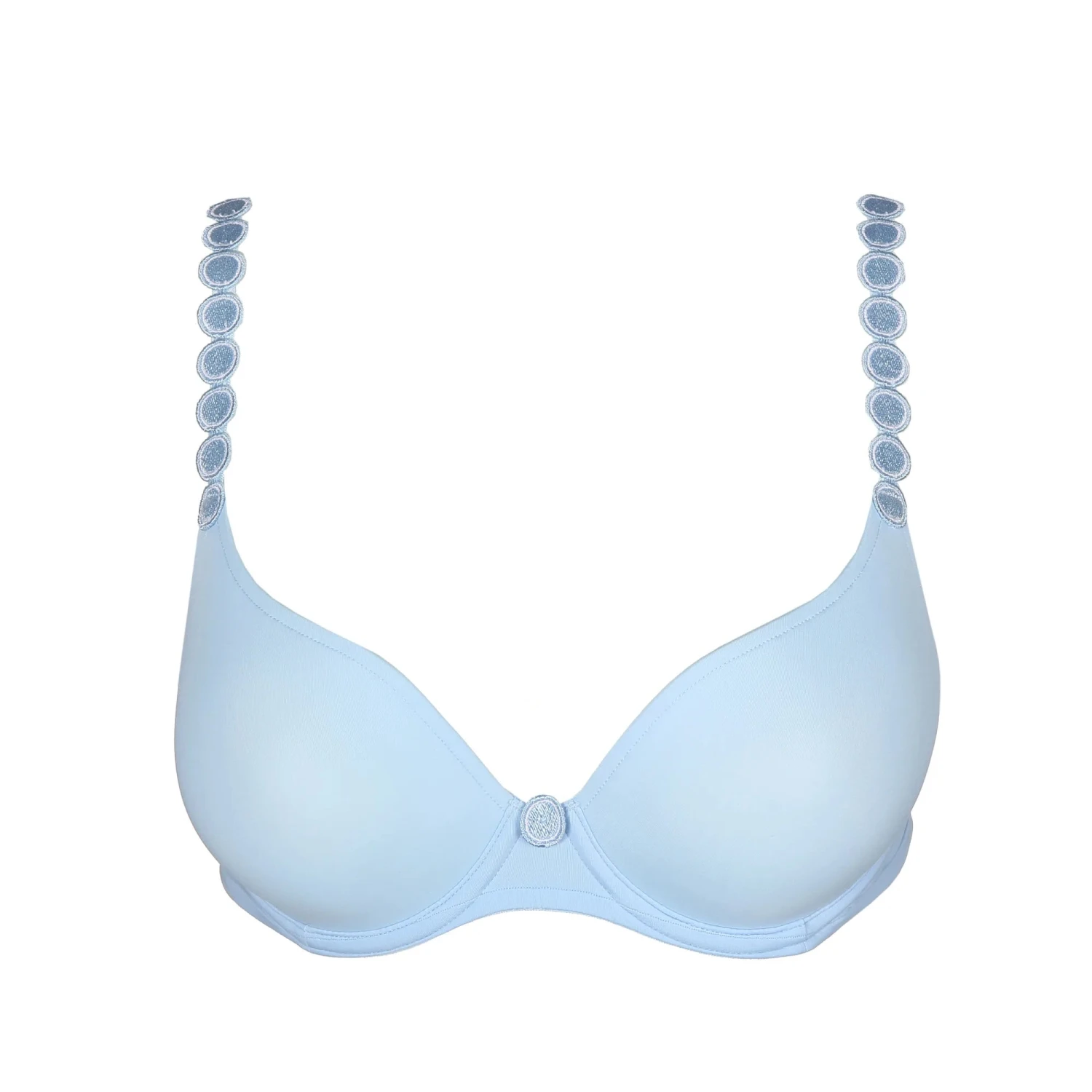 A padded bra with heart-shaped cups. The cups offer excellent coverage at the top. The bra is cut high on the upper cups and then plunges into a deep neckline between the breasts. The sheer tulle on the back is cut straight. The straps can be worn over the shoulders or around the neck.